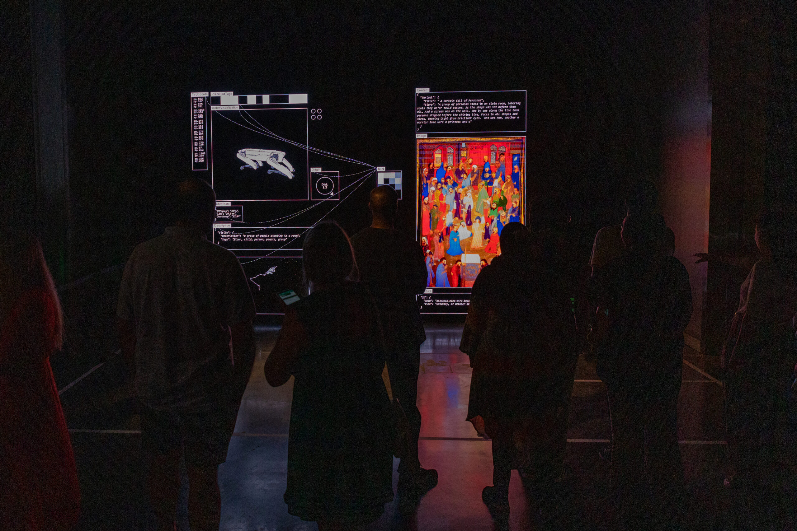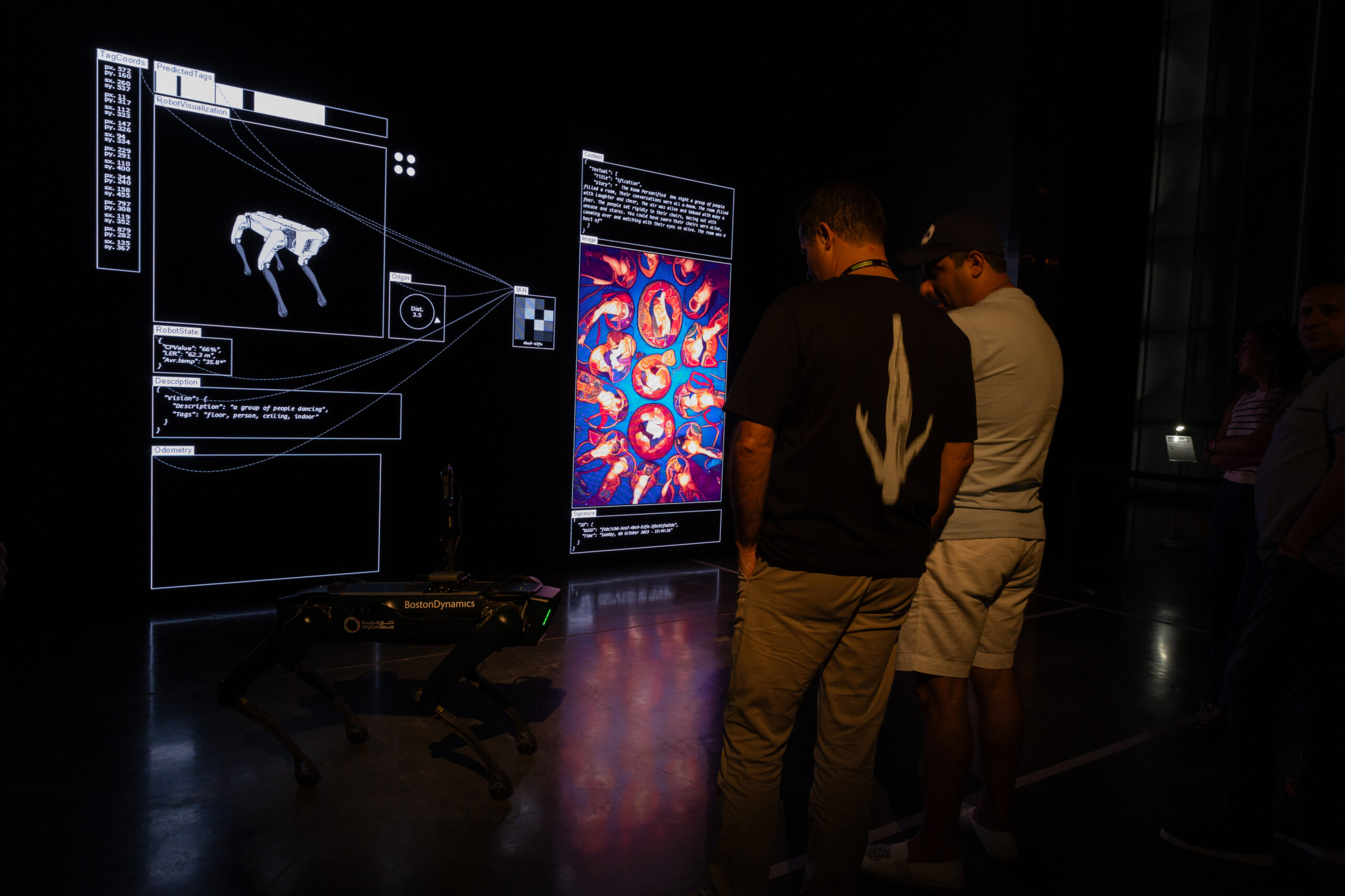 The installation features “bunraku,” a software developed by the artist for behavior-driven interactions, utilizing the Spot robot with a 360 camera to observe attendees. It combines Microsoft Azure Cognitive Services, OpenAI’s API, Stable Diffusion, and Boston Dynamics Spot SDK to control the robot, process data, and generate content for the “Book of Kings.” All activities are coordinated in real-time using “vvvv”.